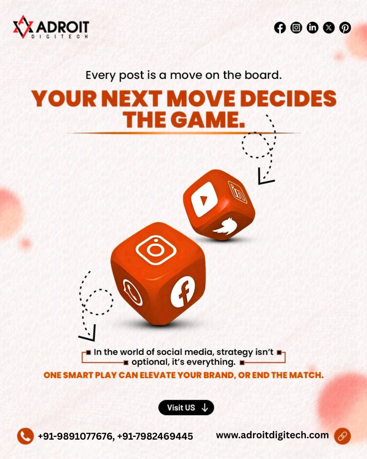The dice imagery in the design reflects calculated risk and smart strategy—exactly how Adroit Digitech approaches social media marketing.