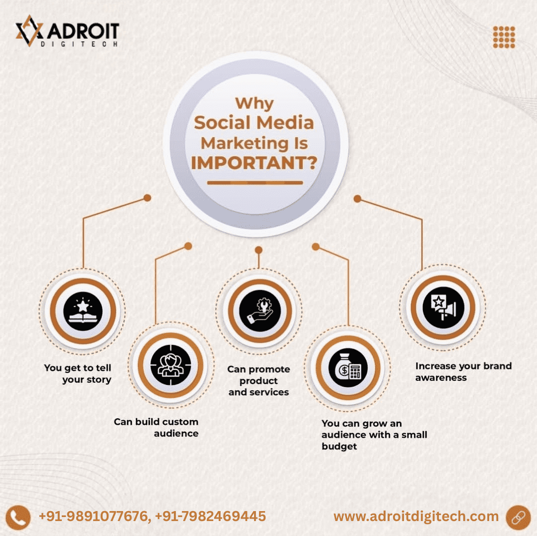 As highlighted in the image above, social media marketing helps businesses tell their story, build a custom audience, promote products and services, grow with a small budget, and increase brand awareness. At Adroit Digitech, we specialize in delivering high-performance social media marketing services in Delhi NCR that help brands rank fast on Google and dominate social platforms.